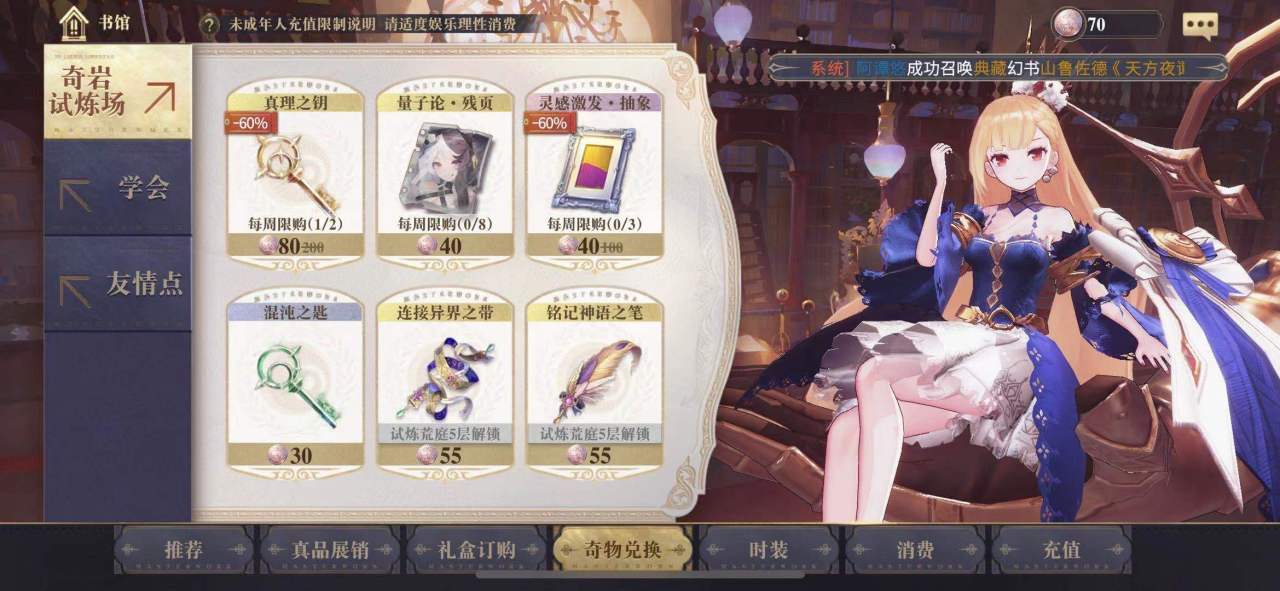 下面我们来说说比较经济的方法,我们可以想办法获得姬币,这个道具可以在画中殿奇岩试炼场中兑换真理之匙,最重要可以直接兑换量子论的残页,这个就比较直观了,我们只要参加奇岩试炼,每天战胜别人就可以获得少量的姬币,而且可以获得一定的积分,这些积分每天都会按照当前的得分进行结算,给与相应的奖励。