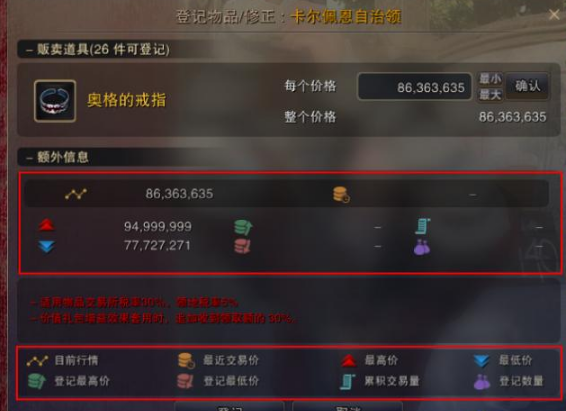 在交易市场界面,能够看见全部物资的市场情况。彩色的表明市场有货,灰色物品则表示暂时缺货。而且每类货品的市场最高价与最低价、现在挂号数目、总计交易量、系统估价等都可以在拍卖界面进行逐一察看。并且,《黑色沙漠》还具有奇特的动态经济系统,市场价格会随着货物的供需关系的转变而转变。