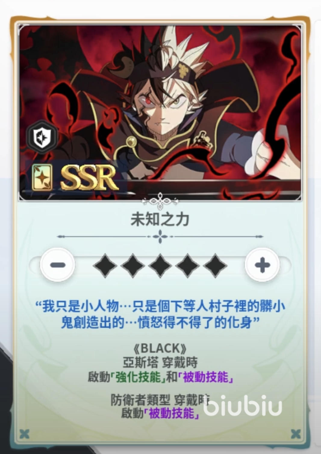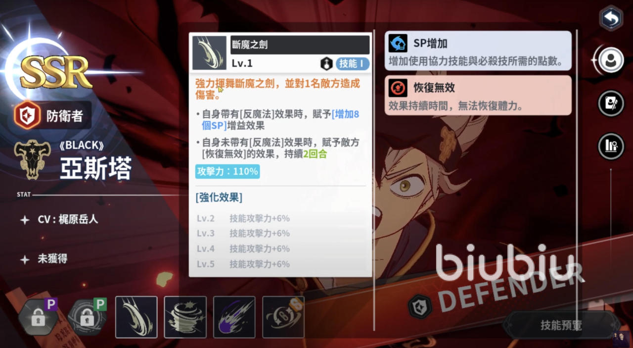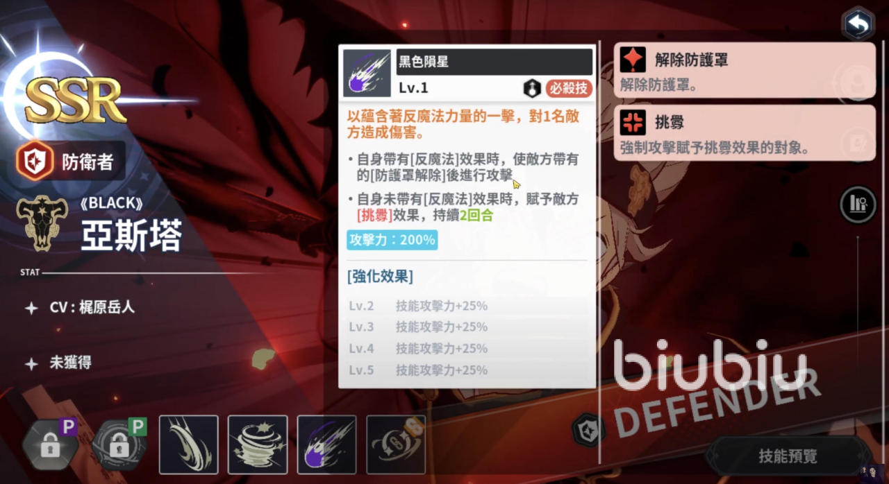 必杀技“黑色陨石”是亚斯塔的爆发手段,单体攻击力高达200%。在拥有[反魔法]时,能直接移除敌方护盾后进行斩击,破防与高额伤害兼具;而若没有[反魔法],则会对敌人施加2回合的[挑衅]效果,将火力集中到自己身上,为队友创造输出环境。这种“双形态”的设计让亚斯塔能在关键时刻承担起主T的职责。