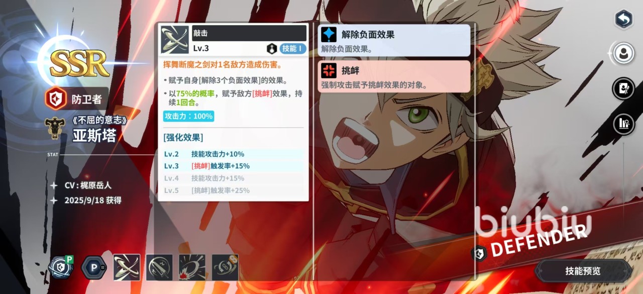 不屈的意志亚斯塔是SSR级别的角色,角色定位为防卫者,是能输出也能当坦克的角色,在游戏里面主修攻击防御和体力,有条件的增加一点暴击能提升该角色的输出上限,专属被动1可以在战斗开始的时候减少自身承受的20%的伤害,觉醒被动1在使用技能二的时候以50%的概率,赋予敌方解除敌方BUFF的效果,觉醒被动2以100%的概率,赋予解除敌方BUFF的效果,在对战的时候非常好用,可以解除敌人的强化,变相削弱敌人。