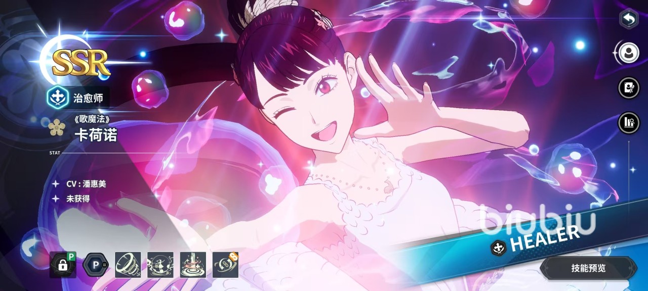 必杀技是根据卡荷诺自身的体力上限来进行基础数值计算,为全队成员恢复一次生命值,如果体力属性堆的比较高,那么一次大招就可以让队伍整体恢复大量血量,还有额外的几率触发全体攻击提升效果。这个技能是卡荷诺的精髓所在,在很多关键场合,一次大招就能成功救场。另外还有专属被动技能,可以提升体力上限,强化自身的护盾强度和治疗量,在觉醒被动后,还有额外体力恢复效果加成,这样就进一步强化了治疗相关技能的效果。协力技能是给伙伴恢复血量,并有几率清除减益状态,在组队打副本的时候非常可靠。