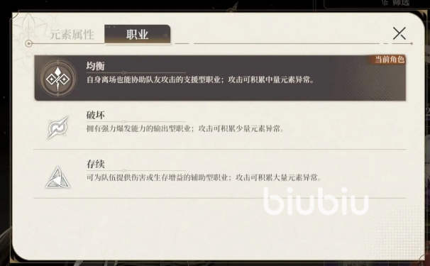 角色需要配队,但在搭配前需要了解他们,角色目前是分为三个职业的,分别是破坏、均衡和存续,不同职业之间定位会不一样,破坏大家可以理解为高攻击力、高倍率,一般能作为队伍的主要输出,存续定位是副C,一般技能中会有一个可以给全队加的buff,非常适合在主要输出一套打完切回后台;