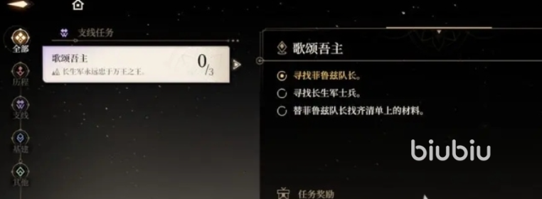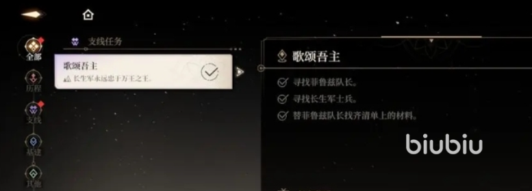 这个任务有三个要求,第一个要求就是寻找传说中的菲鲁兹队长,第二个任务就是一位长生军士兵中的首领,第三个任务便是协助长生军寻找一系列稀有材料,从而满足清单上的所有需求便可以完成任务。