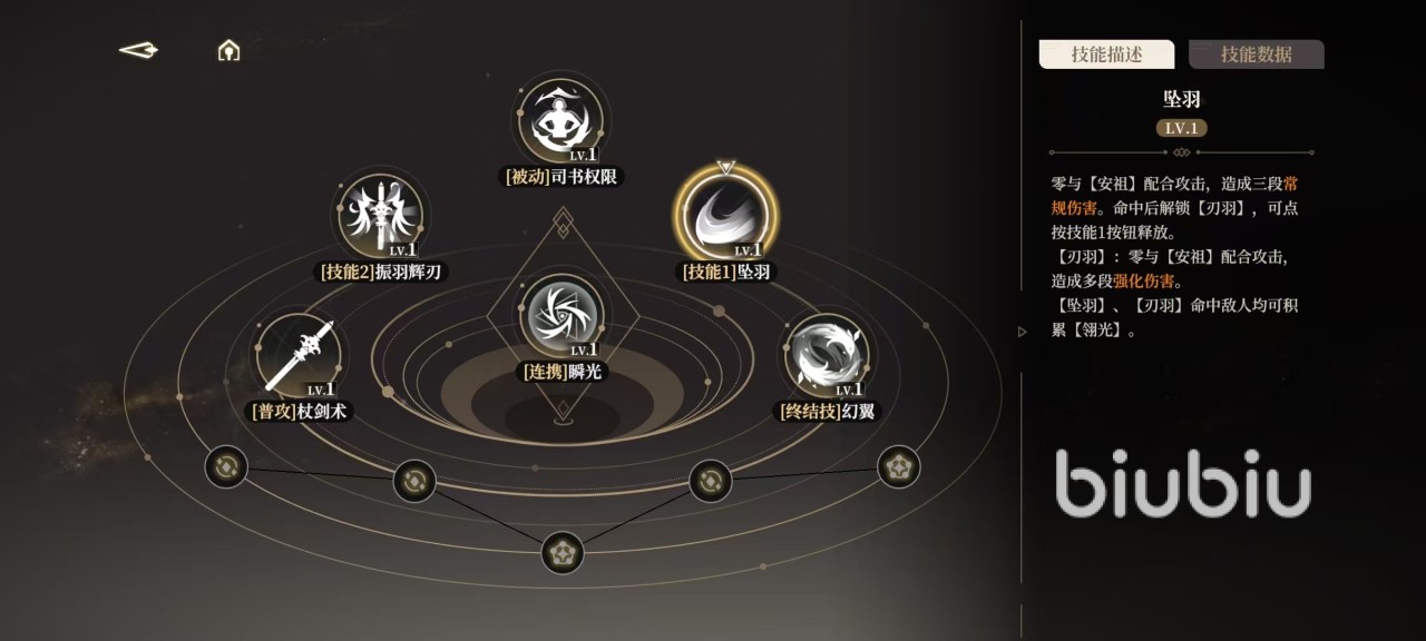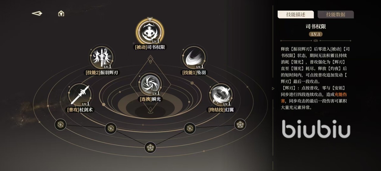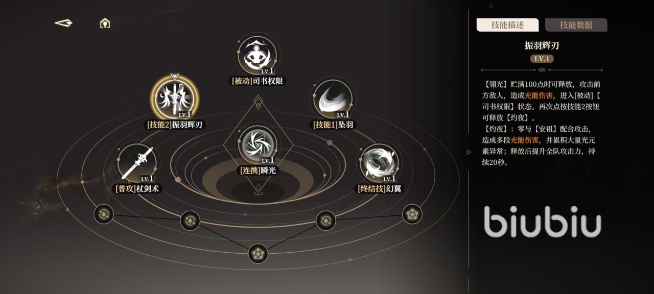 被动司书权限,当释放振羽辉刃后,就可以进入到被动状态中,在此期间是无法获得并且持续消耗翎光,这使普通将会强化为辉刃,直到翎光耗尽。释放灼夜之后的短时间内通过点按普攻的方式可追加辉刃最后一段攻击。辉刃的效果同样可以造成充能伤害并累积大量光元素异常。最后是自身的终结技能,升空并且积蓄势能,落地对周围范围内的敌人造成终结伤害。看似复杂但其实使用时候只需要尽快去将翎光积蓄起来,二技能亮了之后直接就点击,利用好被动带来的强化输出效果攻击敌人就是了。