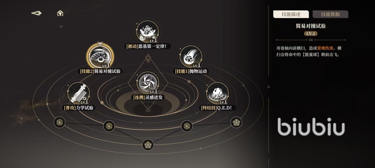 恩基的普攻力学实验,连续三段攻击,通过长按的方式可以发动重击,完美闪避后普攻会进行反击,没有其他的附加效果。第1个技能抛物运动,抛出一个能量球,能量球落地时造成常规伤害,场上最多只能存在一个能量球。2技能简易对撞实验,用横卷轴向前横扫,造成常规伤害,横扫时将会使命中的能量球朝前方击飞。