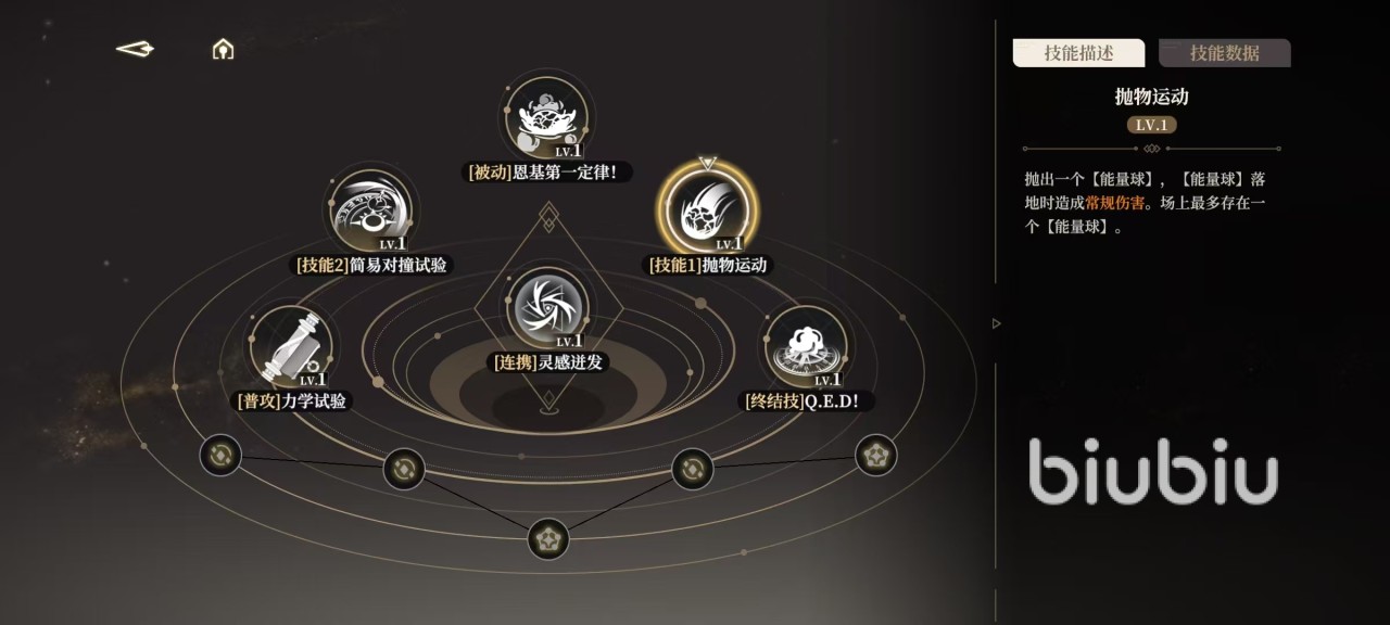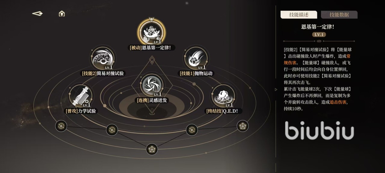 被动可以说将一技能和二技能的效果再次进行了提升,但是又不需要额外操作,只需要继续重复连招就可以将伤害大幅度加强。还有一个终结季,抛出一个展开的能量球,造成终结伤害,随后使用卷轴激活能量球造成终结伤害。当恩基切换上场时,会直接使用卷轴砸击敌人,充能完成时可立即点击连携技释放简易对撞实验,爆发状态期间,每次释放二技能,都会自动在身前先产生一个能量球。