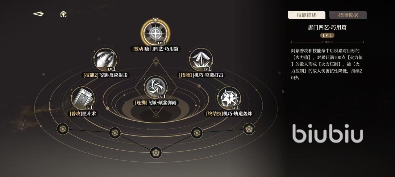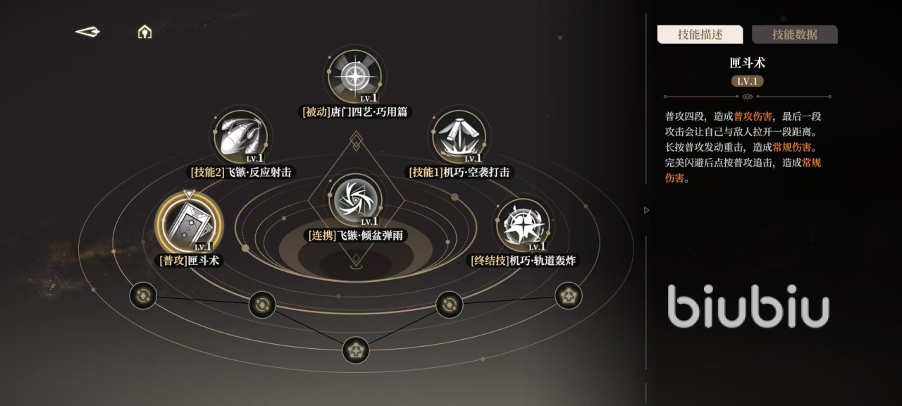 普攻匣斗术,进行四段攻击造成普攻伤害,在最后一段时可以和敌人拉开距离,通过长按方式能发动重击。造成常规伤害,进行完美闪避之后,可以再次点击普攻按键造成追击。被动技能效果,使得普攻和技能在命中后可以积累对目标火力值,当积累达到100点火力值时,就可以形成火力压制,被压制的敌人伤害抗性降低持续20秒。