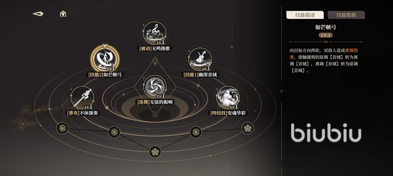当切换上场时会直接挥砍周围的敌人,当连携充能完成时,立即点击可以释放出二技能,如果场上此时没有音域,会自动生成两个音域,在爆发状态期间,二技能会召唤环绕自身的原调音域,并使其扩散一次余音。这些技能效果也和该角色的背景非常贴合,就是利用音符的力量来打出伤害。这样在场上使用的时候就需要不断点击释放技能,还需要进行攻击方向判断,所以要讲究操作。