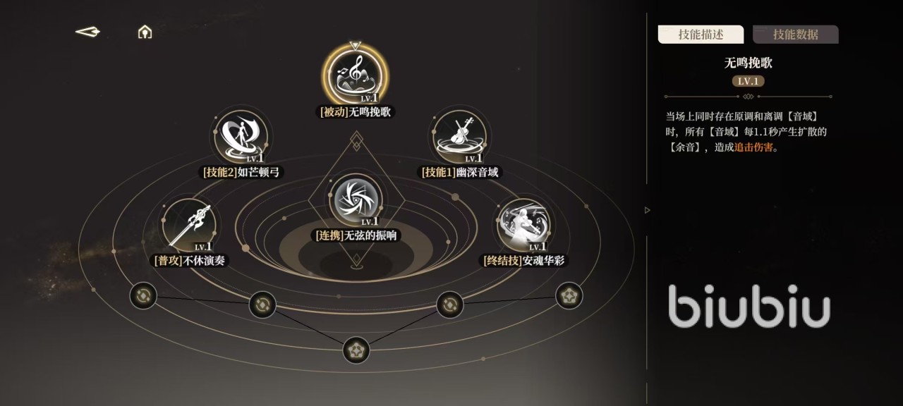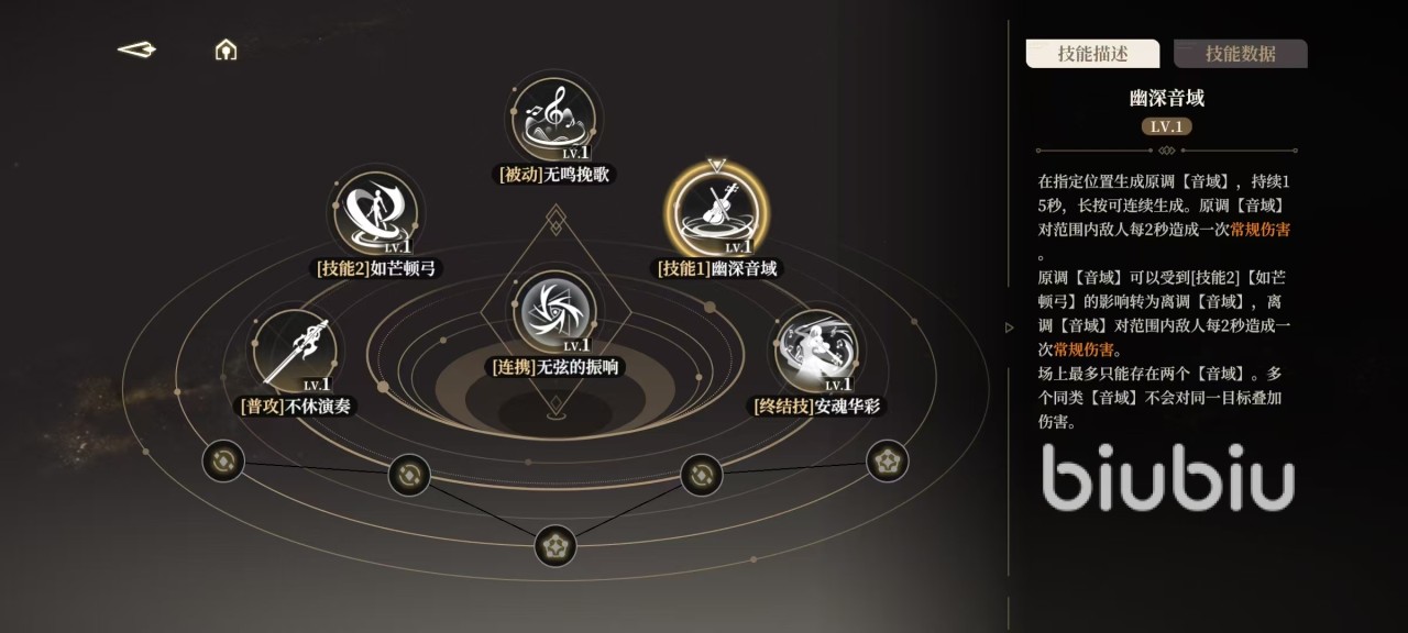 薇奥拉的被动无鸣挽歌,效果是当场上同时存在原调和离调音域时,所有音域每1.1秒产生扩散的余音,造成追击伤害。第1个技能幽深音域,在指定的位置生成原调,持续15秒,长按技能可以连续生成。原调对范围内敌人每两秒钟就造成一次伤害,原调还会受到二技能影响转换成离调,离调对范围内敌人每两秒造成一次伤害,场上最多只能存在两个音域,多个类型音域并不会叠加伤害。