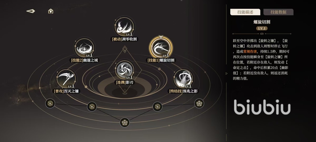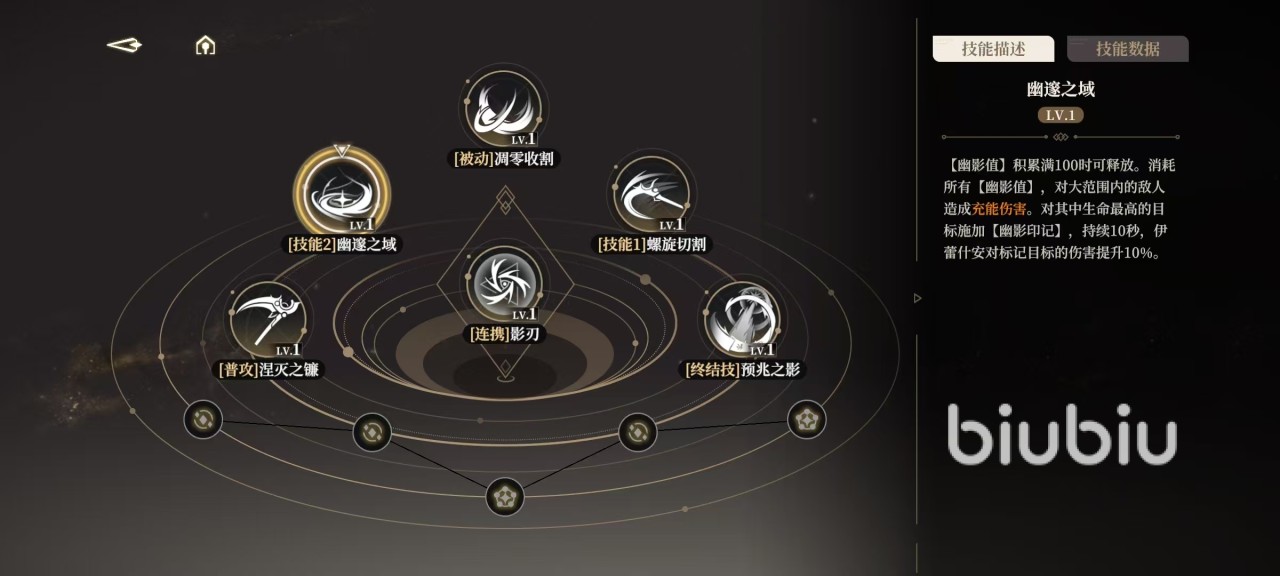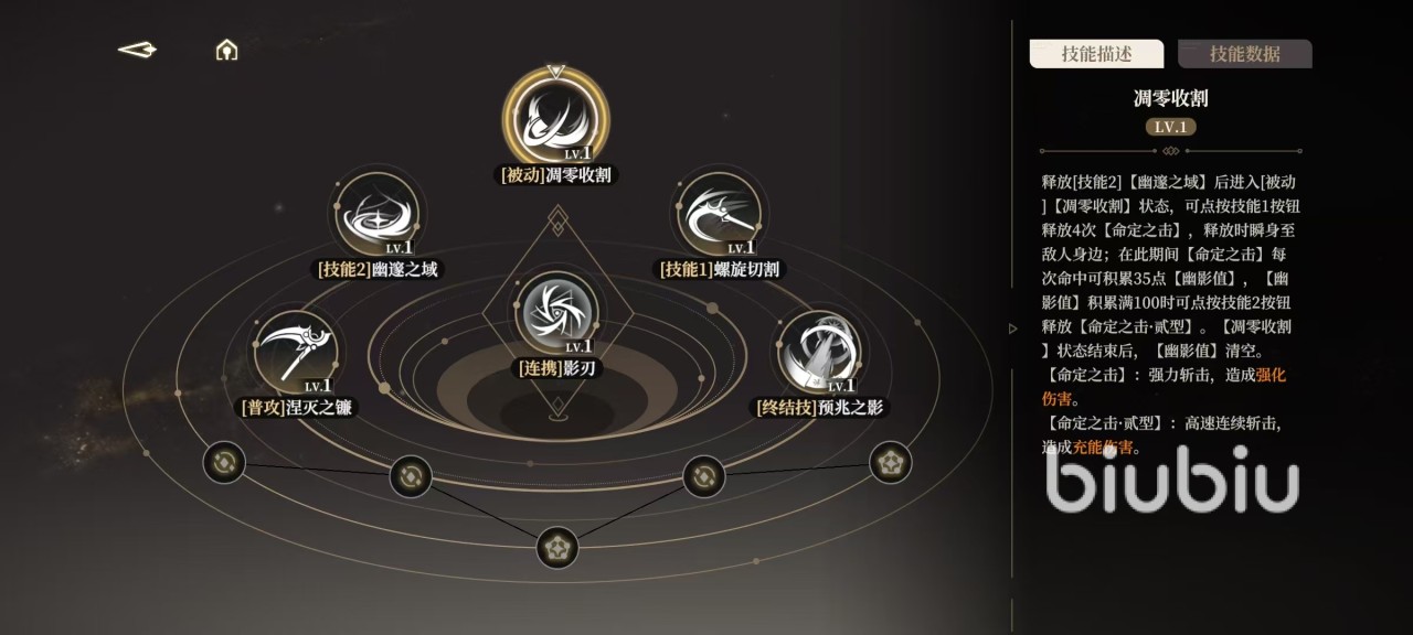 被动技能凋零收割,二技能释放之后会进入到凋零收割状态,通过点击一技能按钮释放4次命定之击,释放时可以瞬移至敌人身边。在此期间每次命中可以积累35点幽影值。积累满100后,可以点按技能二按钮释放命定之击贰型。在凋零收割状态结束后幽影值清空,命定之击贰型可以进行高速连续斩击。