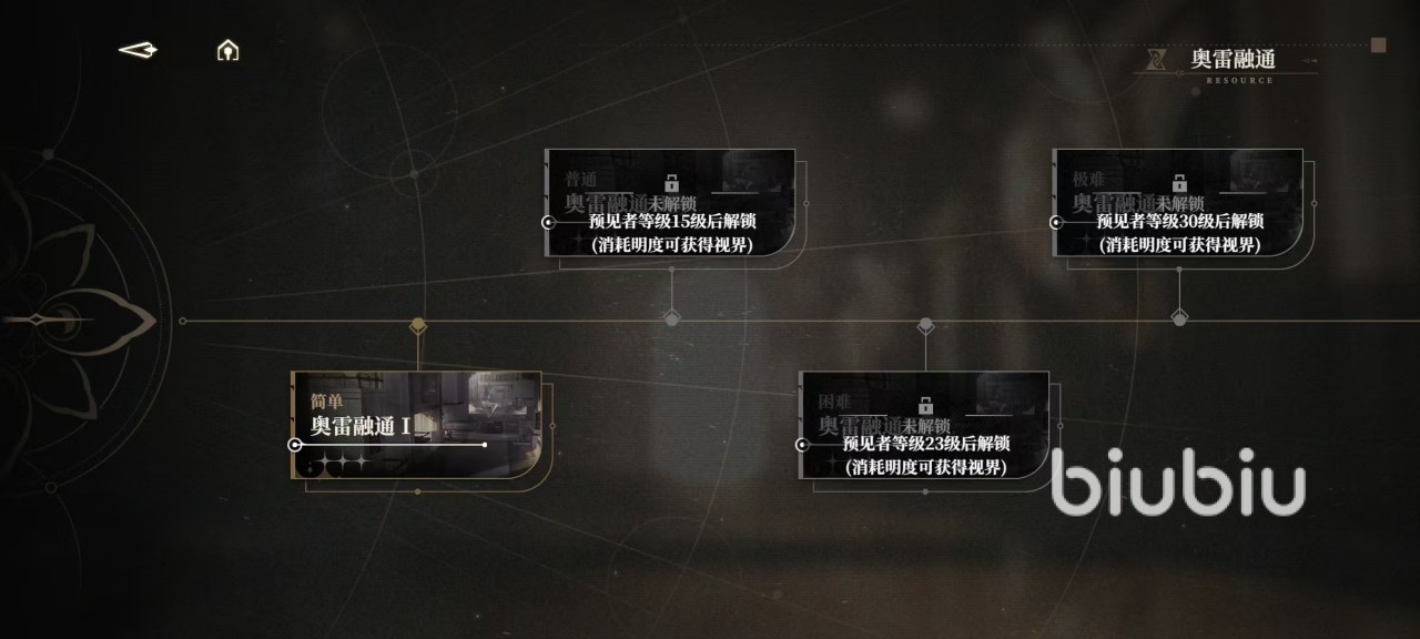 接下来就是专门获取奥雷的活动,打开战斗选项之后找到资源页面,在这里就可以看到有奥雷融通活动。该活动分为不同的难度,从简单、普通到困难等,难度越高,掉落的奥雷自然也就越高。需要大家在挑战时候达成一定的目标,除了通关之外,还要没有成员阵亡,还要限定一定的时间,这样就可以获得最高奖励了。首次战斗时还有首通奖励,后续可以利用扫荡来快速获得。