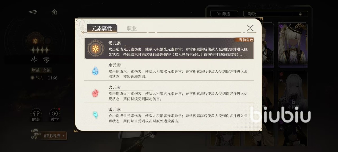 玩家所使用的所有角色都根据元素来进行划分,分别是水、火、雷、光、暗这5种元素类型,在战斗时遇到的怪物,也会有不同元素弱点,这时就需要根据对方弱点选择对应元素角色,起到克制作用后伤害会非常明显。不同元素所造成的伤害也有着独特效果加成,例如水元素,攻击造成水元素伤害,使敌人积累水元素异常,异常触发时造成伤害,使目标进入凝滞状态并造成短暂的冻结效果。