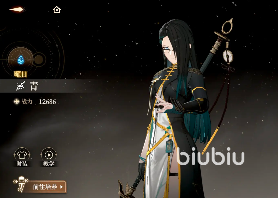 青有着文雅温和的外表,她的普攻是4段总共会形成198%普攻输出值,被动会在每次“疾刀”和“止澜”命中敌人后将下一次普攻强化,进行下劈攻击对前方直线上的敌人形成394.35%输出值,并且期间自身为霸体状态,她的一技能会向指定方向移动并攻击,形成253.55%输出值,成功命中会激活“疾刀”向指定方向移动并攻击,二技能会在原地圆形攻击形成267.85%输出值,成功命中激活“止澜”再进行一次原地圆形攻击,她的终结技会跳跃到半空中,向下劈斩出水浪形成601.7%的高额伤害。