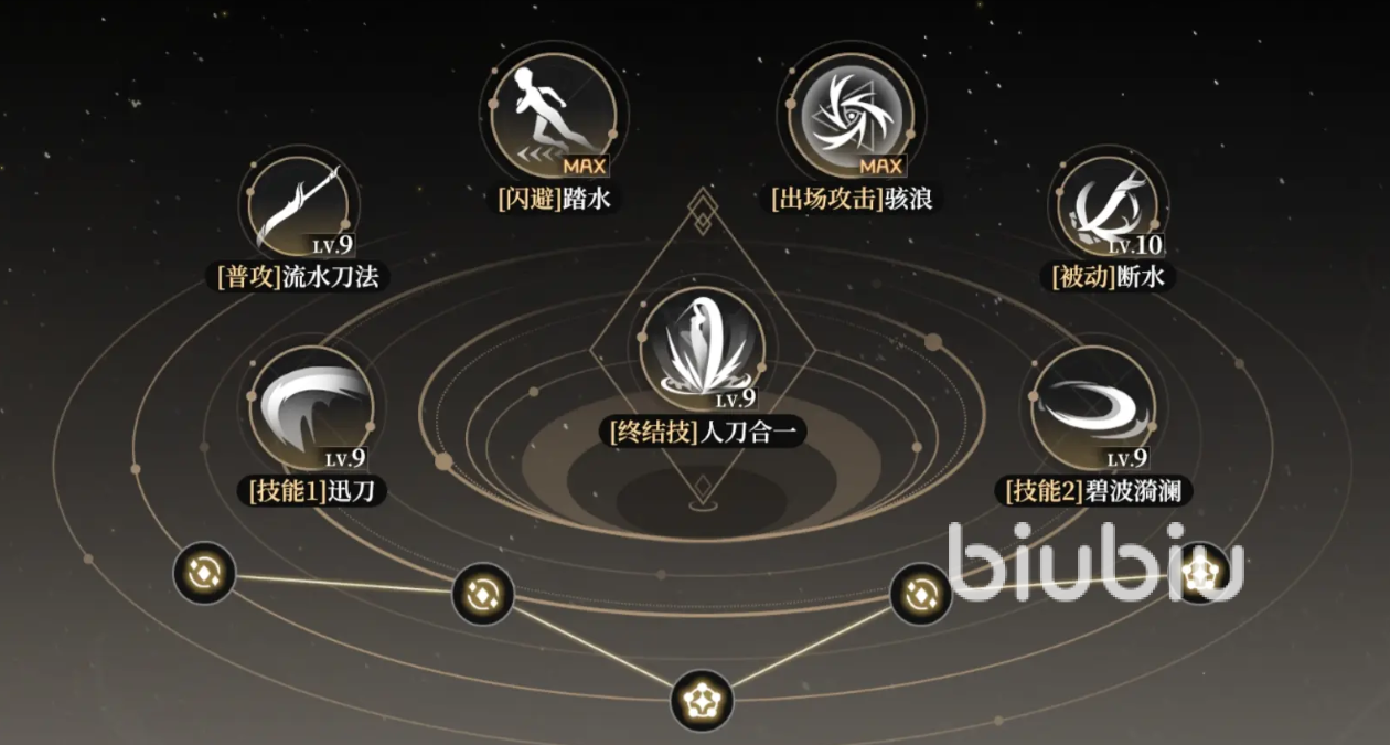 她的二技能会挥舞双刃朝着前方跃进,形成226.05%伤害,受到被动强化后释放,该招会进行更多段的攻击,额外形成207.35%输出值,释放后全队还能获得持续16秒50%的伤害增幅,她的绝技会投出利刃,形成以自己为中型的空间,让利刃在里面持续穿刺敌人形成481.8%伤害。