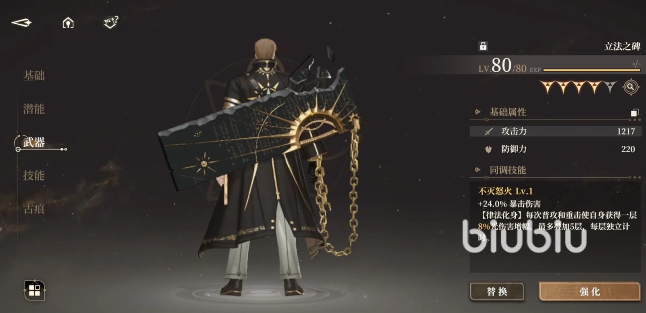 沙琪玛的专武是立法之碑,这个武器能带来攻击力和防御力的加成。武器同调技能上是“不怒之火”,能增加24%的暴击伤害。触发【律法化身】被动技的话能增加每次普攻和重击时能获得一层8%光伤害增幅,最多能叠加5层,每层拥有自己的倒数计时,也就是说如果能叠到5层的话,能维持这个增幅效果很长时间。