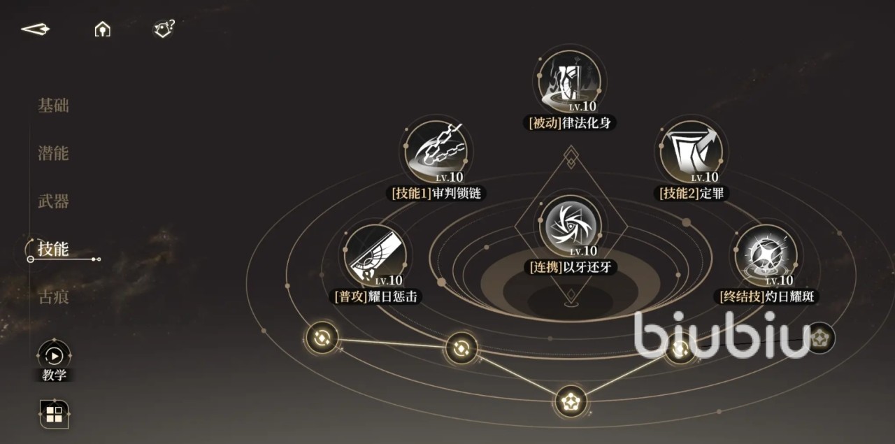 在沙琪玛的技能上,他的技能有普攻【曜日惩击】,技能1【审判锁链】;被动技能【律法化身】,被动的连携技能【以牙还牙】,技能2【定罪】,终结技【灼日耀斑】。