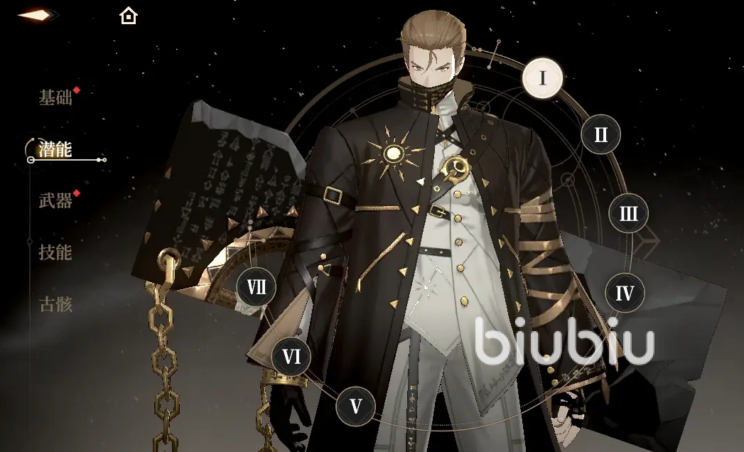 他的第一个技能会朝着选定方向丢出炽链对命中目标形成116.6%伤害后,将自己牵引至其身边进行撞击,若炽链成功牵引目标,后续还会顺势使用石碑攻击敌人形成高额输出值并获得20怒气,他的二技能会用石碑格挡敌人的攻击,格挡成功对敌形成131.45%输出值获得50怒气,激活“公正裁决”对敌人追击造成232.1%输出值,她的终结技会在前方召唤光轮产生大爆炸,形成558.25%伤害。