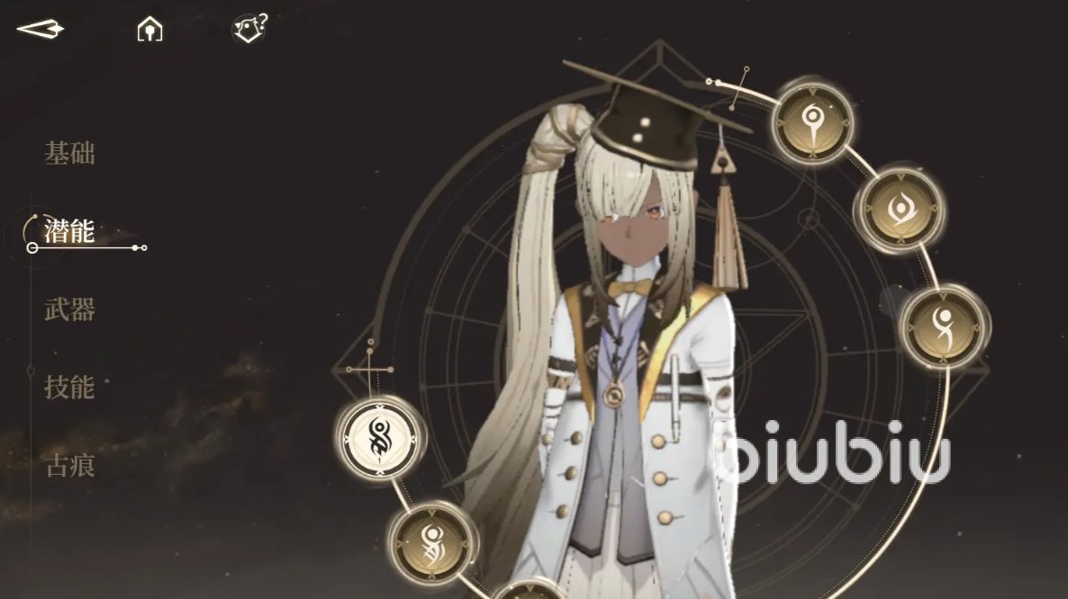 她的普攻发动四段攻击,造成671%输出值,第4段若成功命中会累积1点造物泥沙,她的被动是在登场时会召唤石像,发动的攻击会和石像一起,她的1技能会瞬移到指定地点,让石像砸击形成137.5%范围伤害,并使得自己短时间内下一次普攻可直接释放第四段,她的二技能会在造物泥沙累计3点是解锁,释放后形成275%伤害并赋予全队一个持续15秒的护盾,她的终结技会跳到空中指挥石像蓄力一击形成超大范围的输出值。