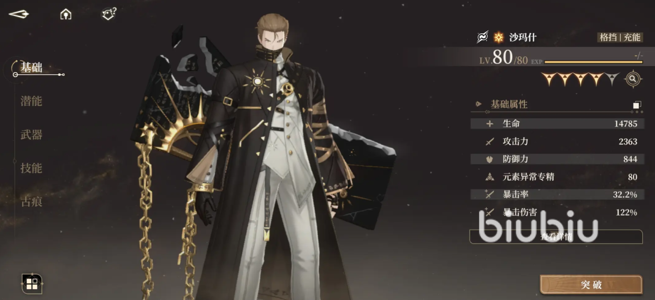 他的一技能会朝着选定方向丢出炽链对命中目标形成116.6%伤害,并将自己牵引到目标身边进行一次撞击,技能二会格挡敌人攻击,若成功对敌人形成131.45%输出值,获得50怒气,他的终结技会在前方召唤出光轮产生爆炸共形成558.25%充能伤害。
