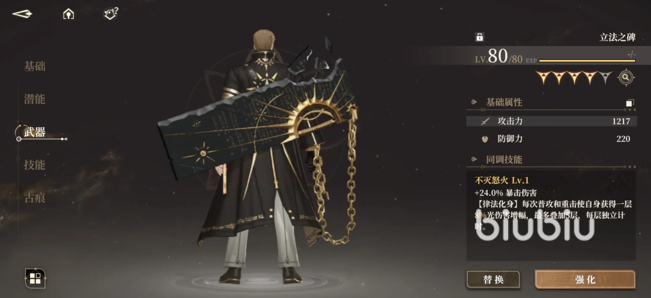他拥有超越年龄的老练和成熟,被动是在怒气到100后,一、二技能替换成“律法化身”对周围形成209%充能伤害,并进入到罪行清算状态,该状态下普攻获得强化,长按普攻还会释放日轮,跳起后朝目标冲击形成92.95%充能伤害;