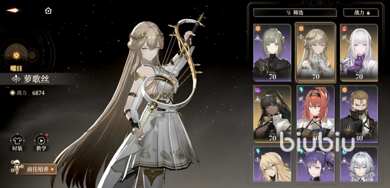 萝歌丝普攻有4段,第4段命中会得到1枚弦音,她的被动是每次释放“变奏”和满蓄力的“协奏”时,会进入到调律,若弦音数量同时也达到上限会对其进行清空,并让普攻变成向四周发动范围攻击,并在场上召唤出会10秒音符,音符会自动跟随角色,让场上生命高于80%的队友获得攻击加成,并在有队友发动攻击时协同进攻,她的“变奏”会向前突刺,命中敌人后得到1枚弦音,并短暂进入到调律状态,若已经在该状态下则额外再形成一次伤害;