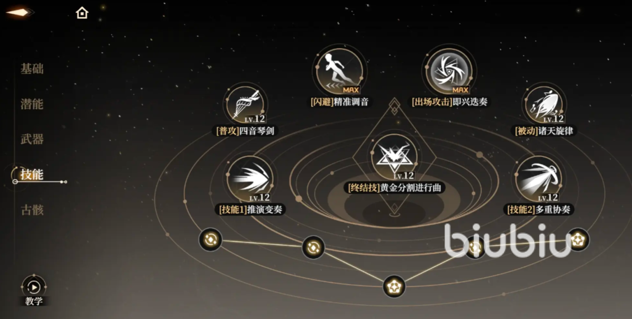 她的普攻总共有4短,总共会形成136.4%输出,第四段普攻命中敌人能得到一枚“弦音”,若在调律状态下,普攻从第三段起长按能发动重击,形成15.95%重击输出,她的出场攻击会在登场时,刺击周围敌人造成48%输出值。