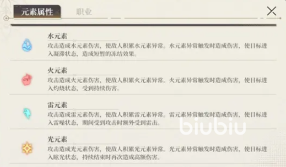 水会让目标进入到凝滞中,形成短暂的冻结效果,火会让目标进入到灼烧中遭受到持续伤害,雷会让敌人进入到雷噪中,状态期间只要受到攻击就会额外遭受雷击,光会让敌人进入到眩光状态,持续时间结束再次造成高额伤害。