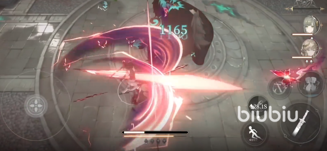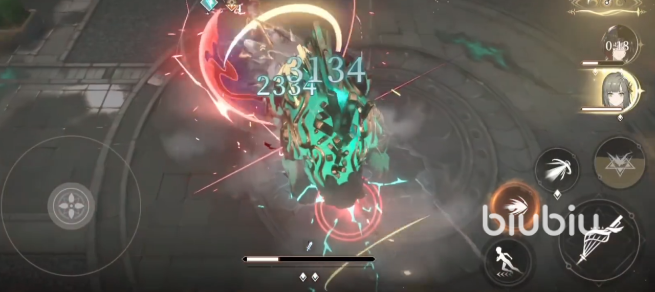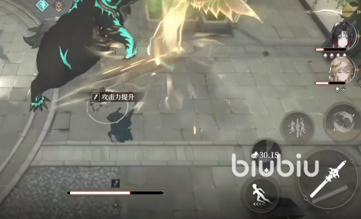 不过这时他的血量依旧健康,接着还是按照这些流程去打。等你的主C角色技能进入冷却时间之后,就可以切换成为萝歌丝。一方面可以继续输出,另外一方面得挂上增伤的buff,然后用又能够挂上治疗能力;治疗过后,就能继续安心攻击了。