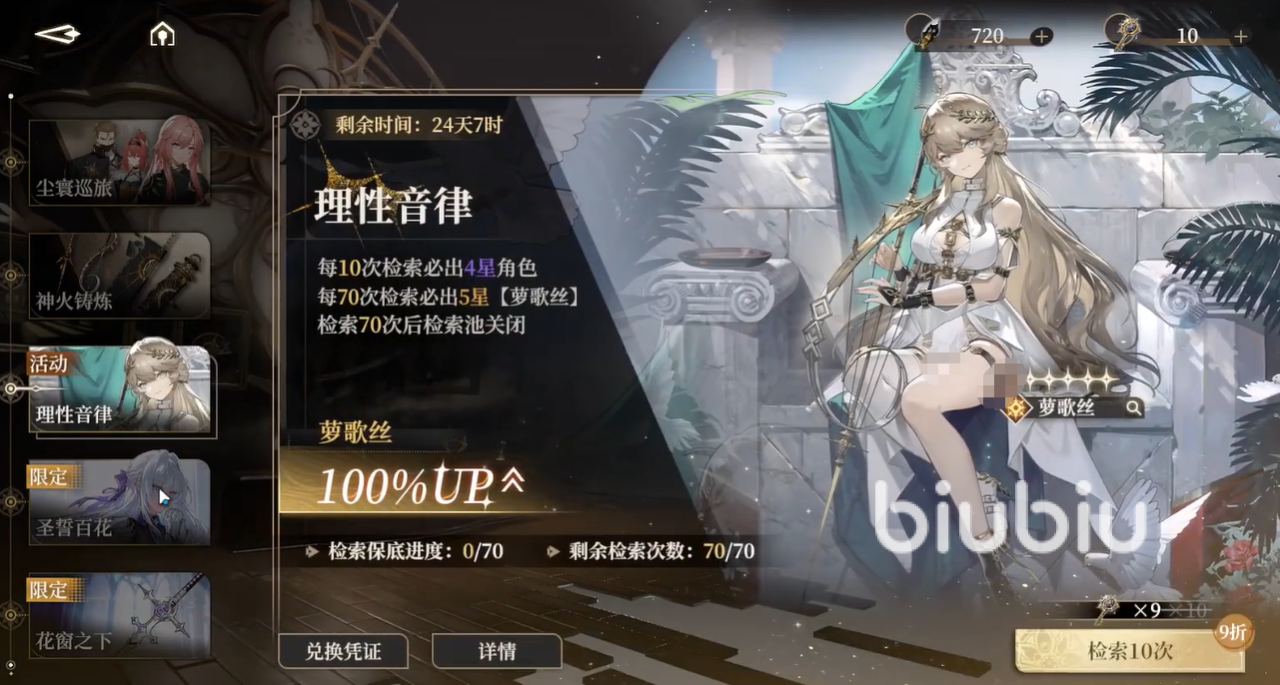 最后再来讲一下黄金密钥能拿来干什么,黄金密钥可以在活动卡池中100%抽到一个奶妈角色,也就是大家心心念念的五星奶妈萝歌丝。在限定时间,只要抽9次就可以获取了。所以大家要优先抽这个卡池,除此之外,黄金密钥也可以用来抽限定卡池,灵活抽取个人需要的角色。