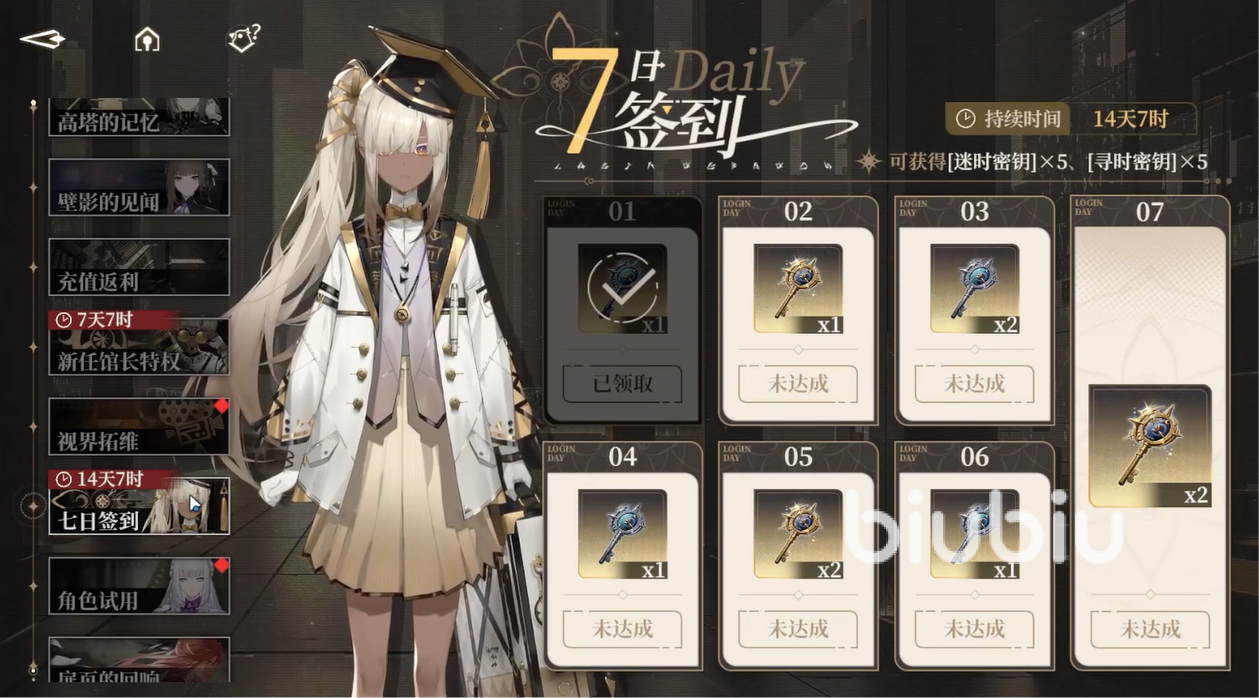 7日签到的活动规则也特别简单,只要上线7次并领取对应的奖品,就可以获得所有的福利了。第一天的话大家可以获得5个迷时密钥,这种密钥其实是一种抽卡道具。可以直接用来抽取常驻角色或者武器,对于新手来说的话,抽30次就可以选一个五星角色。