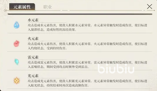 战斗角色依据元素属性分为水、火、雷、光、暗五种类型,怪物在战斗中会有不同的元素弱点,因此可以根据敌方的弱点有针对性地选择具有对应元素的角色上场。同时,不同元素在造成伤害时,也拥有各自独特的附加效果。只要理解了各元素在战斗中的表现机制,配队时就有了清晰的方向。每种元素攻击都会在战斗中对敌人造成对应的异常积累效果,而当积累达到一定程度时,会触发该元素的异常状态。不同的异常效果如下: