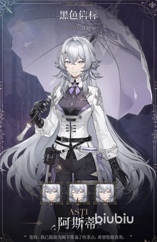 阿斯蒂的被动是在场上的伞被二技能成功命中后会产生水浪,水浪对敌人会造成59.4%输出并为全队施加一次治疗,她的第一个招式会把手中的伞给丢出去,对路上碰触到的敌人造成多次输出,她的第二个招式会朝着最近的伞进行快速的冲刺,对期间碰触到的所有敌人会造成118.8%输出,她的大招会朝着前方召唤出一个龙卷风,被龙卷风波及到的敌人会遭受2次144.1%的输出,随后爆炸再对范围敌人造成输出值。