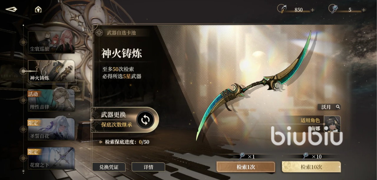 但是神火铸炼又是一种特别人性化的武器卡池,因为虽然也是随机抽取某把武器。但是却给了大家一种自选的机会,这样就不用担心自己花费了几百抽之后还抽不到想要的东西。因为只需要最多50次抽卡,那么就必定可以获得一把自己选择的五星武器。