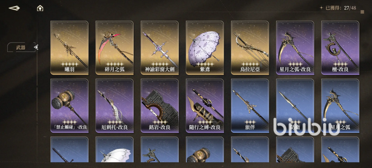 然后每期所up的武器卡池都不一样,例如当前所up的角色是伊蕾什安的话,那么这期所出现的专属武器就是这个角色的专武。当然这个专武他不一定说只能这个角色用,也可以让其他适配的角色使用。然后也有一些常驻的五星武器,同样可以在自选中选用。