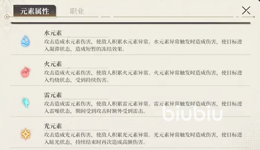 所有的战斗角色都可以分成水、火、雷、光和暗五种元素类型,在战斗中我们遭遇的怪物都会有不同的元素弱点,根据它们的弱点选择相应攻击角色,能让战斗更加轻松,此外不断的攻击会对怪物造成特别的元素异常累积,每一种元素异常触发的效果不同,比方说水元素会造成短暂的冻结,火会让敌人进入到灼烧中,受到持续伤害等,具体的大家可以直接看下图;