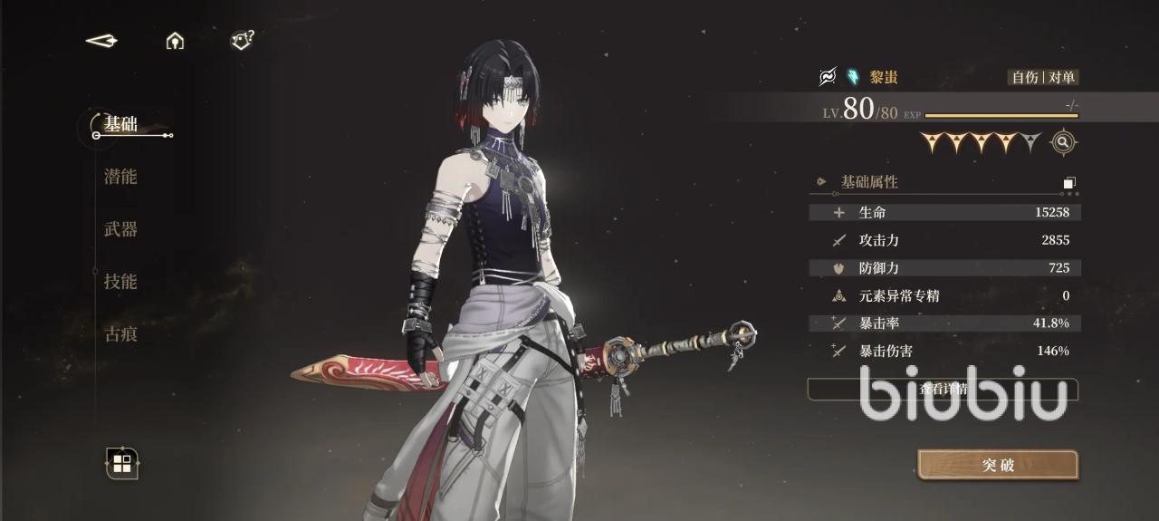 黎蚩也是一名T0的输出英雄,雷属性。被动可以积攒战意,同时可进入到不同的状态,通过不同的状态,对敌方造成不同的攻击效果。1技能”穿血”,蓄力冲刺,不仅能对命中的敌人打出高额输出,而且冲刺七点留下的残影还能攻击最后命中的敌人,沿途的敌人也都受到伤害。