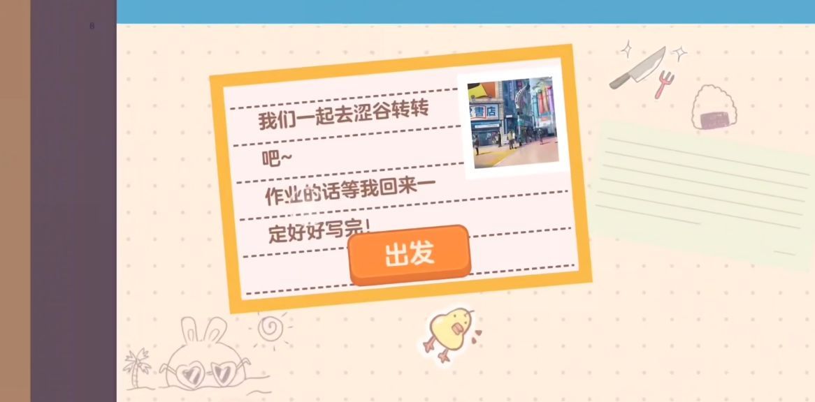首先前期胡桃能去的地点只能是涩谷,涩谷的面积也是很大,胡桃很多次出行都是一个地方,玩家觉得很没意思,这时候地图应用卡就很必要了。地图应用卡购买之后和打工卡一个道理,需要装在胡桃的旅行包的左边,并且配备相应的食物,接下来我们的胡桃就可以去我们指定的方向旅行了。