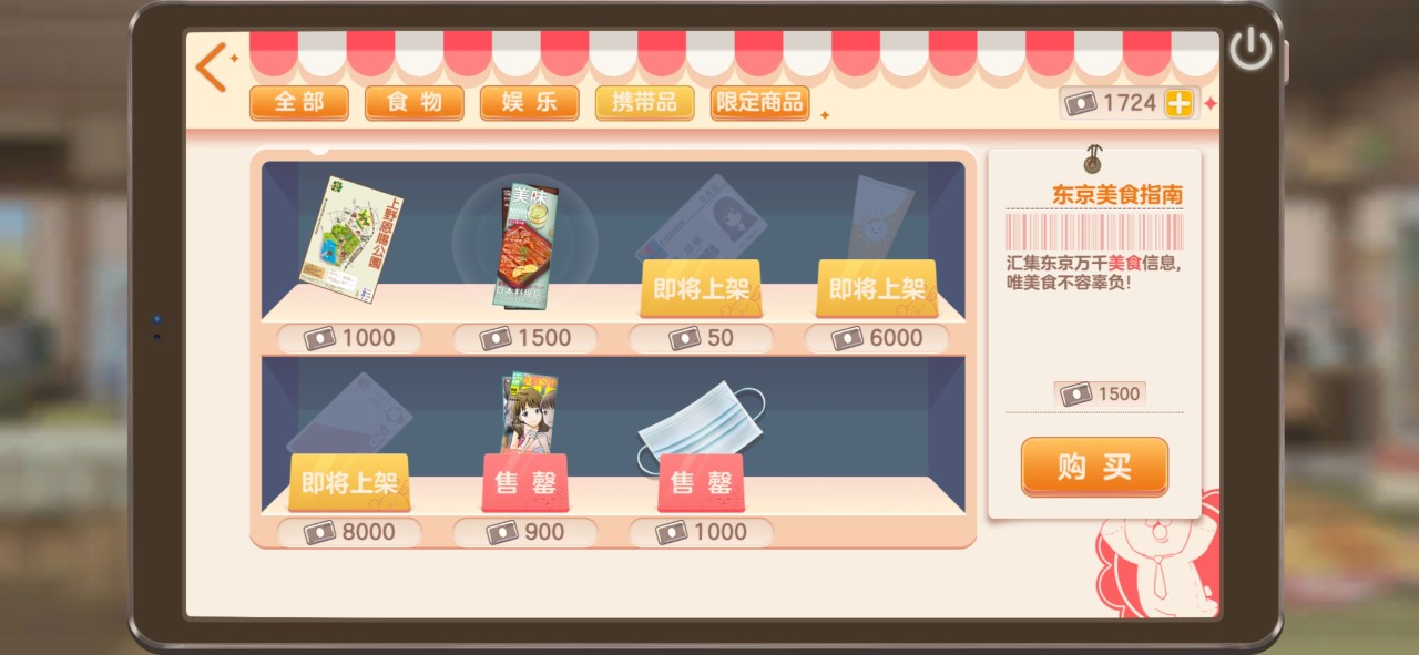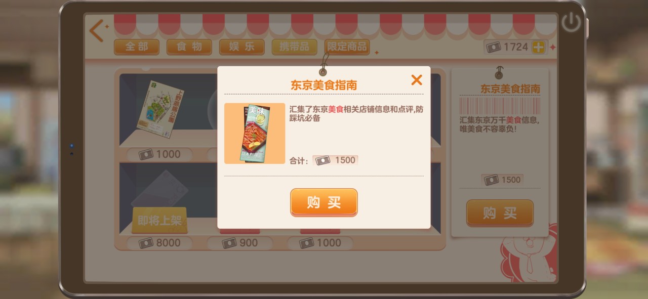 首先东京美食指南位于平板电脑里面的便利店,然后找到携带品,里面的都是胡桃出行的必备品,东京美食指南售价1500零钱,汇聚东京千万美食信息,唯美食不可辜负。东京美食指南是胡桃第二天游玩东京的必备品,其他两个物品分别是:上野观光指南和少女时尚杂志,分别可以去到涩谷和原宿两个地方。