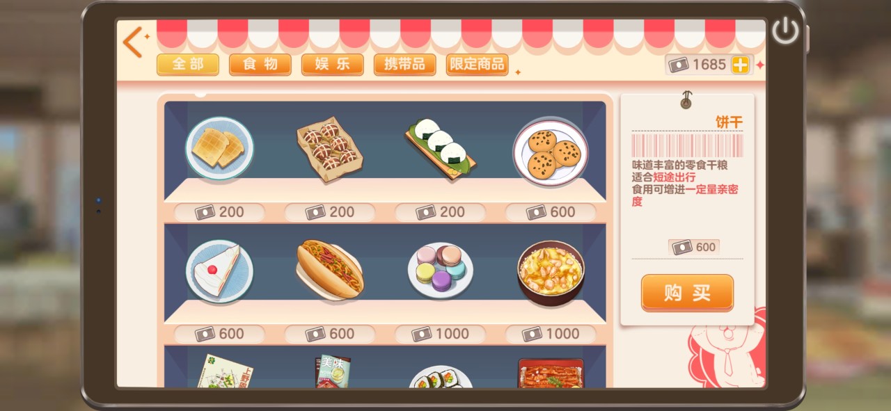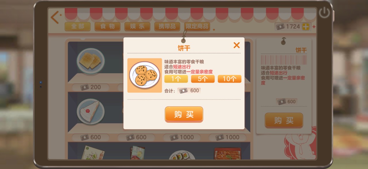 首先饼干是游戏中的一种食物,可以在平板电脑、便利店、食物那一列进行购买,饼干需要花费600零钱,是一款味道丰富的零食干粮,很适合短途旅行,食用之后可以增进与玩的的亲密度。注意经常让胡桃吃饼干的话会减少胡桃对玩家的好感度,以至于等级太低解锁不了剧情任务。