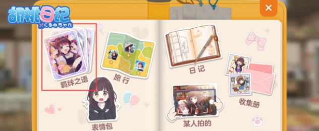 玩家们来到游戏的主界面之后,在主界面下方的那一排找到那个相册图标,找到了之后直接点击进入,就来到羁绊之语的界面了,到了该机面的玩家们就可以选择想要提升的属性卡片,选好之后画面就跳转到升级界面了,直接按照对应标识进行升级就可以了。选择好了之后玩家们就可以到自己的成分鉴定界面查看桃子的总数值。
