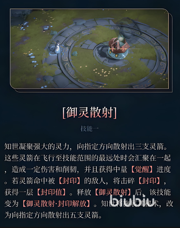 凝聚强大灵力,向指定方向散射出三支箭,箭飞行至最远距离时将汇聚于一点,造成范围伤害与削韧效果,并积累中量觉醒进度。若箭命中封印状态的敌人,会击碎封印并添加封印值。释放此技能后,施展秘术,向指定方向散射五支灵箭。