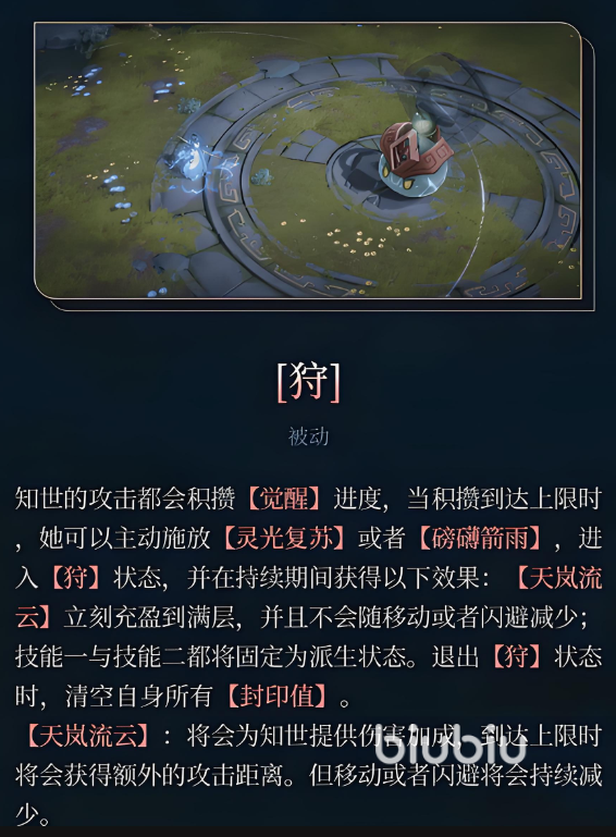 角色通过攻击攒进度,达到上限后可施放复苏或箭雨,进入狩,期间得到天岚流云补满,移动或闪避不会减少其层数。技能一与技能二固定为派生形态,退出狩时清空封印数值。此外,天岚提供输出加成,满层时提升攻击距离,但移动或闪避会持续减少当前层数。
