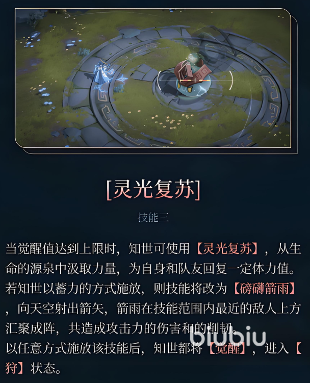 角色在觉醒值达到上限时可使用灵光复苏,汲取生命源泉的力量,为自身及队友回复一定体力值;若通过蓄力方式施放,则技能派生为磅礴雷雨,向天空射出的箭矢将在范围内最近敌人上方汇聚成阵,总计造成攻击力X的伤害与X点削韧值。无论以何种方式施放该技能,角色都会强制触发觉醒,进入狩。