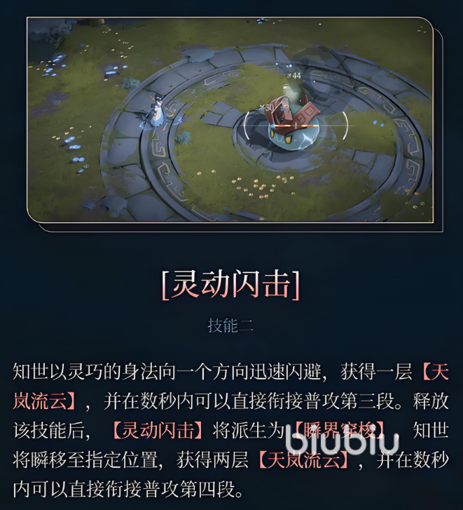 角色以灵巧身法向指定方向迅速闪避,获得一层天岚流云,并在数秒内可直接衔接普攻第三段。释放后,该技能将派生为瞬界穿梭,知世瞬移至指定位置,获得两层天岚流云,并可在数秒内直接衔接普攻第四段。