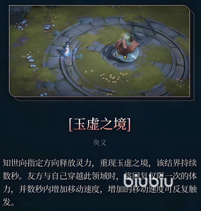 知世向指定方向释放灵力,构筑持续数秒的玉虚之境结界,当友方或自身穿越该结界时,将获得一次性的体力回复与持续数秒的移动速度提升,其中移速加成效果在反复穿越结界时可重复触发。