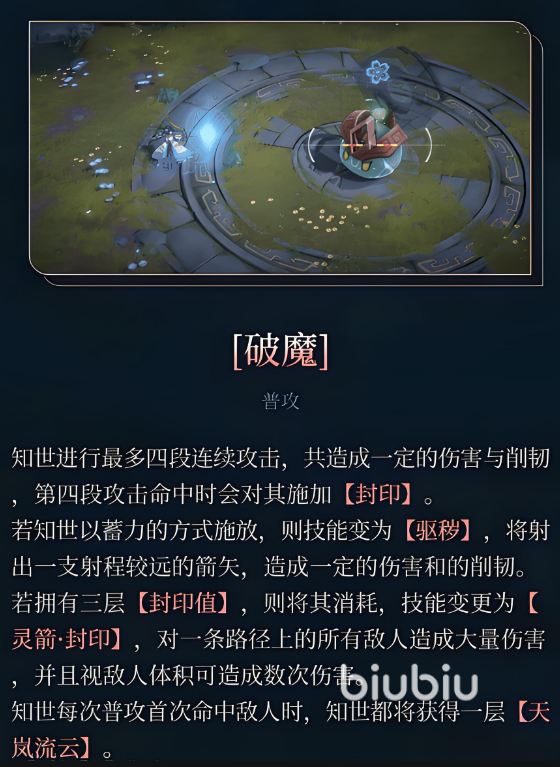 知世可进行最多四段连续攻击,造成伤害与削韧效果,其中第四段命中时还会为目标附加封印状态。若通过蓄力施放,转变为驱秽,射出一支远程箭矢,对目标造成伤害并削韧。当封印值达到三层时,可消耗全部层数将技能强化为灵箭封印,对路径上的所有敌人造成大量输出,且根据敌人大小,可能触发多次伤害。此外,知世的每次普攻在首次命中敌人时,都会为她叠加一层天岚流云效果。