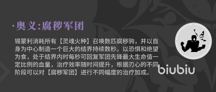 锡蒙利的奥义技能需消耗所有灵魂火种,效果极为强大,会召唤腐秽军团的灵体协同作战,并在战场中心创造一个持续时间较长的大型结界。此结界具备独特的双重机制,对范围内的敌人施加负面效果,同时为范围内的友军提供增益,增益效果将优先提升锡蒙利自身的生命值与生命恢复效率。此外,该技能还拥有成长性,治疗加成会根据锡蒙利当前的韧性阶段获得不同幅度的提升,使其在持续作战中愈战愈强。