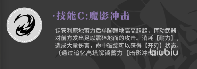 锡蒙利的三技能魔影冲击是一个强力输出技,使用时她需在原地蓄力,消耗耐力并挥动武器对前方造成巨额范围伤害,伴随震碎地面特效,对范围内所有敌人生效。此技能的核心价值在于其高额的伤害加成,若能精准命中敌人的破绽,还将触发开刃效果,是集爆发与战术性于一身的关键技能。