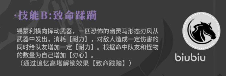 锡蒙利的二技能致命蹂躏是一个集伤害、召唤与团队辅助于一体的多功能技能。使用时,她会进行横向挥击造成基础伤害,并同步从刃锋中召唤出幽灵马驹灵体,这些召唤物在消耗自身耐力对敌人造成伤害的同时,会将部分力量反馈给全队,为队友恢复耐力。此外,该技能命中敌人后,还能根据队友的状态为锡蒙利自身增加韧性,这种独特的攻防兼备与团队续航能力,使其在面对群怪关卡时表现尤为出色。