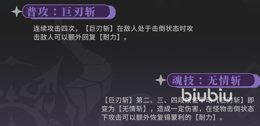拥有军团先锋这个称号的角色是锡蒙利,定位是刀剑类型,需要利用武器进行输出。普攻巨人斩可连续带来四次输出,若敌人处于倒地状态,那么攻击敌人时还可额外恢复耐力。巨人斩强化之后得到的无情斩,效果更强,玩家只需按住技能键不动,然后将巨人斩优化即可完成无情斩,无情斩通过长按技能键触发,此强化技能不仅继承了基础版的高额伤害,还新增了强大的续航效果,当攻击倒地状态的怪物时,能为锡蒙利恢复一定数值的魔力。这一机制使其从一个纯输出技能,变为一个集爆发与续航为一体的全能型技能。